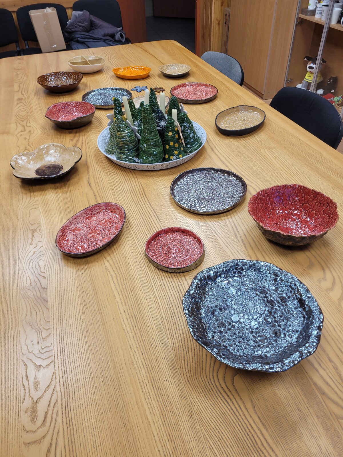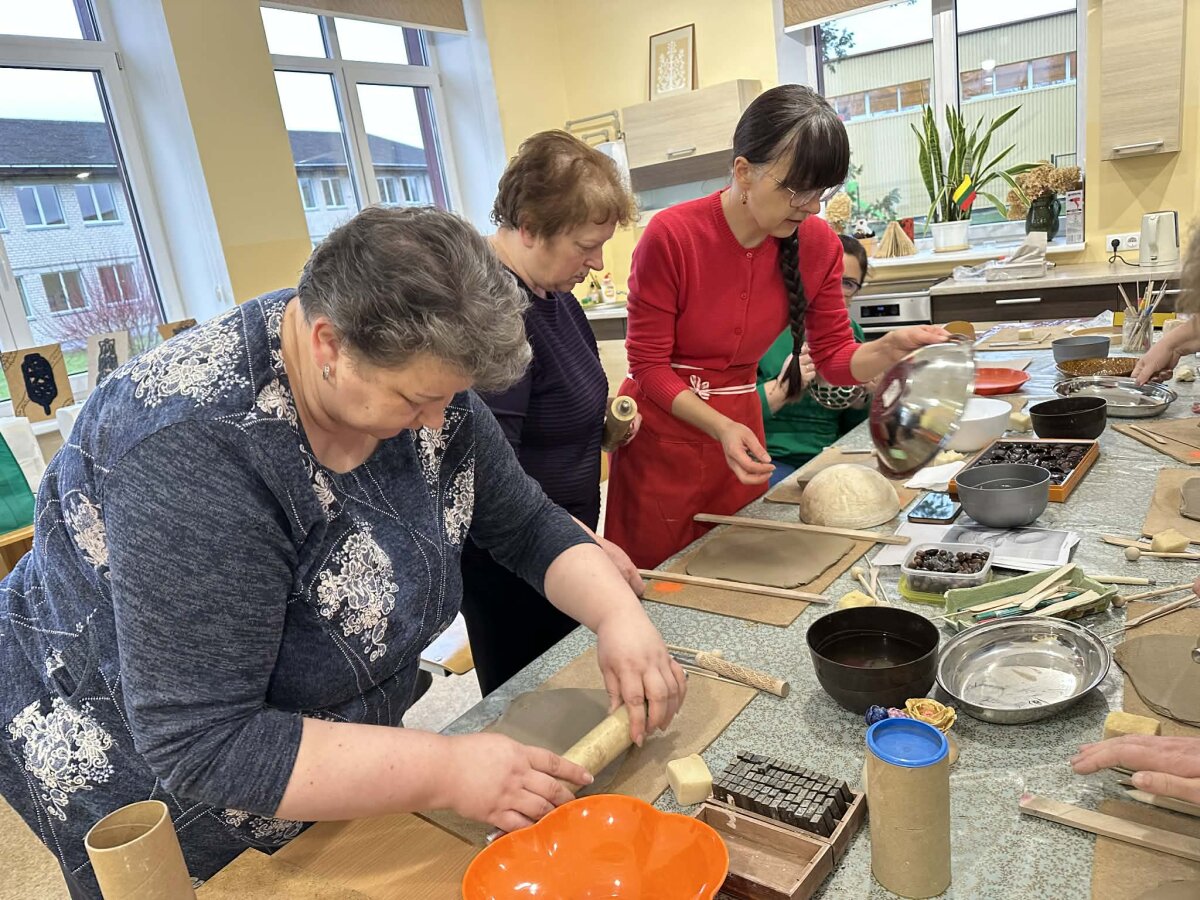 Mokytojai dalyvavo kūrybinėse keraminio indo kūrimo dirbtuvėse. Pirmojo užsiėmimo dalį sudarė lipdymas iš molio, o antrojo užsiėmimo metu buvo glazūruojami jau išdegti indai. Nemenku iššūkiu tapo glazūrų pasirinkimas ir derinimas. Po antrojo degimo visos su nekantrumu laukė rezultato. Išdegti indai nustebino grožiu – ne viena negalėjo patikėti, kad tai jų rankų darbo gaminys. Pabaigti gaminiai buvo eksponuojami mokytojų kambaryje. Smagu, kad kūrybinė veikla suteikė džiaugsmo, atsipalaidavimo ir virto tokiu puikiu rezultatu.