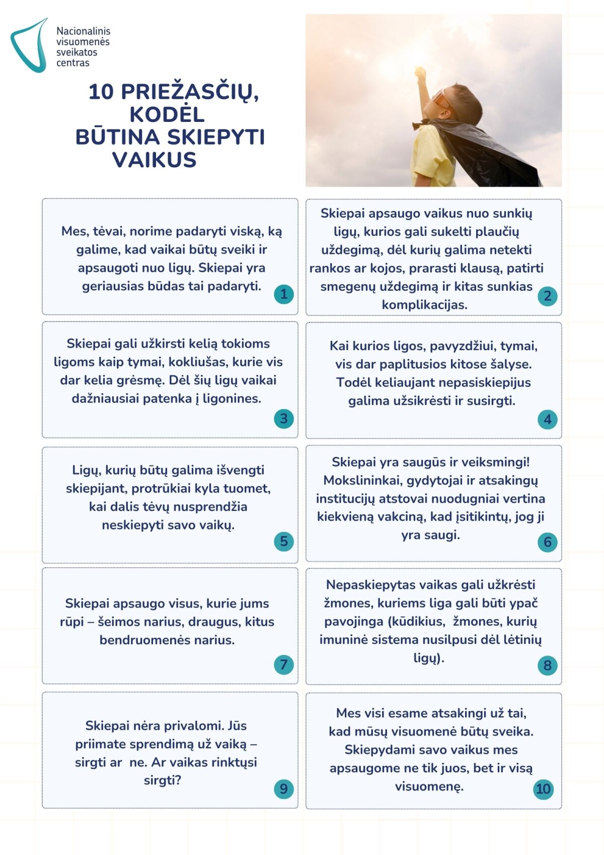 Jeigu kyla klausimų dėl skiepų veiksmingumo, saugumo, juos visada galima užduoti gydytojui. Išsamią informaciją apie vaikų profilaktinį skiepijimą Lietuvoje, atsakymus į dažniausiai kylančius klausimus, nuorodas į patikimus Europos ir Lietuvos informacijos šaltinius rasite NVSC interneto svetainėje adresu https://nvsc.lrv.lt/vaikai. Čia taip pat turėsite galimybę pasitikrinti, ar priimdami sprendimus dėl vaikų skiepijimo nesivadovaujate mitais – vaizdinguose video klipuose trumpai ir aiškiai išdėstoma, kodėl vienas ar kitas įsitikinimas gali būti paremtas ne mokslu pagrįsta informacija.