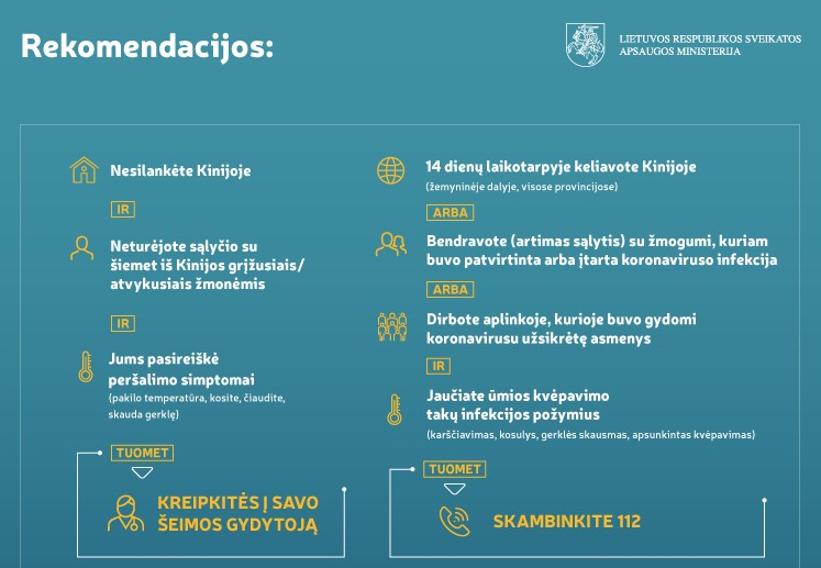 Jeigu 14 dienų laikotarpyje lankėtės Kinijoje ar Šiaurės Italijoje (Lombardijos, Veneto, Pjemonto ir Emilijos-Romanijos regionų) ar kituose paveiktuose regionuose ir grįžę pajutote simptomus, panašius į gripo, NEIKITE į polikliniką, NEPLATINKITE VIRUSO, o KREIPKITĖS Į BENDRĄJĮ PAGALBOS CENTRĄ TEL. 112.. Atsižvelgiant į tarptautinių ekspertų išvadas, rekomenduojama žmonėms, kurie neseniai grįžo iš Kinijos ar Šiaurės Italijos, 14 dienų nuo paskutinės buvimo minėtose šalyse dienos likti namuose ir stebėti savo sveikatą ir pateikti duomenis apie save NVSC. Norint pateikti informaciją apie save, reikia kreiptis į NVSC šiais būdais: tel. nr. +370 5 212 4098, tel. paštu;info@nvsc.lt; arba užpildant formą, kurią rasite čia