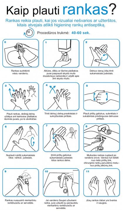 - Dažnai plaukite rankas ir naudokitės dezinfekciniais skysčiais, servetėlėmis, ypač po kontakto su užterštais paviršiais, nelieskite rankomis veido.